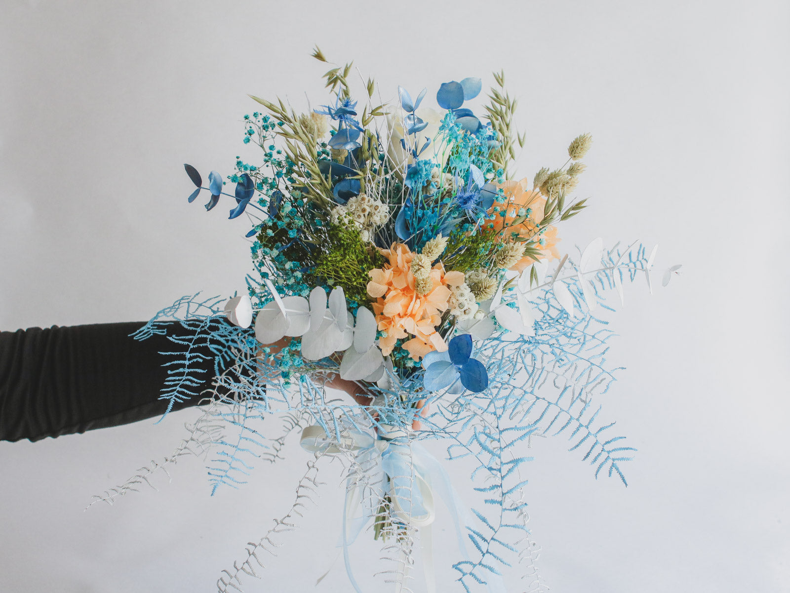 Estos ramos silvestres combinan la delicadeza y la textura envolvente de la hortensia preservada y la alegría de la paniculata de colores, junto con eucalipto, avena y gramíneas que aportan movimiento y naturalidad.